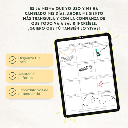 Lo mejor de todo es que no necesitas hacer cambios extremos para sentirte más organizada. Esta agenda tiene secciones flexibles y adaptables que se ajustan a tu estilo de vida, para que puedas planificar tus días sin agobiarte. ¡Todo sin estrés!